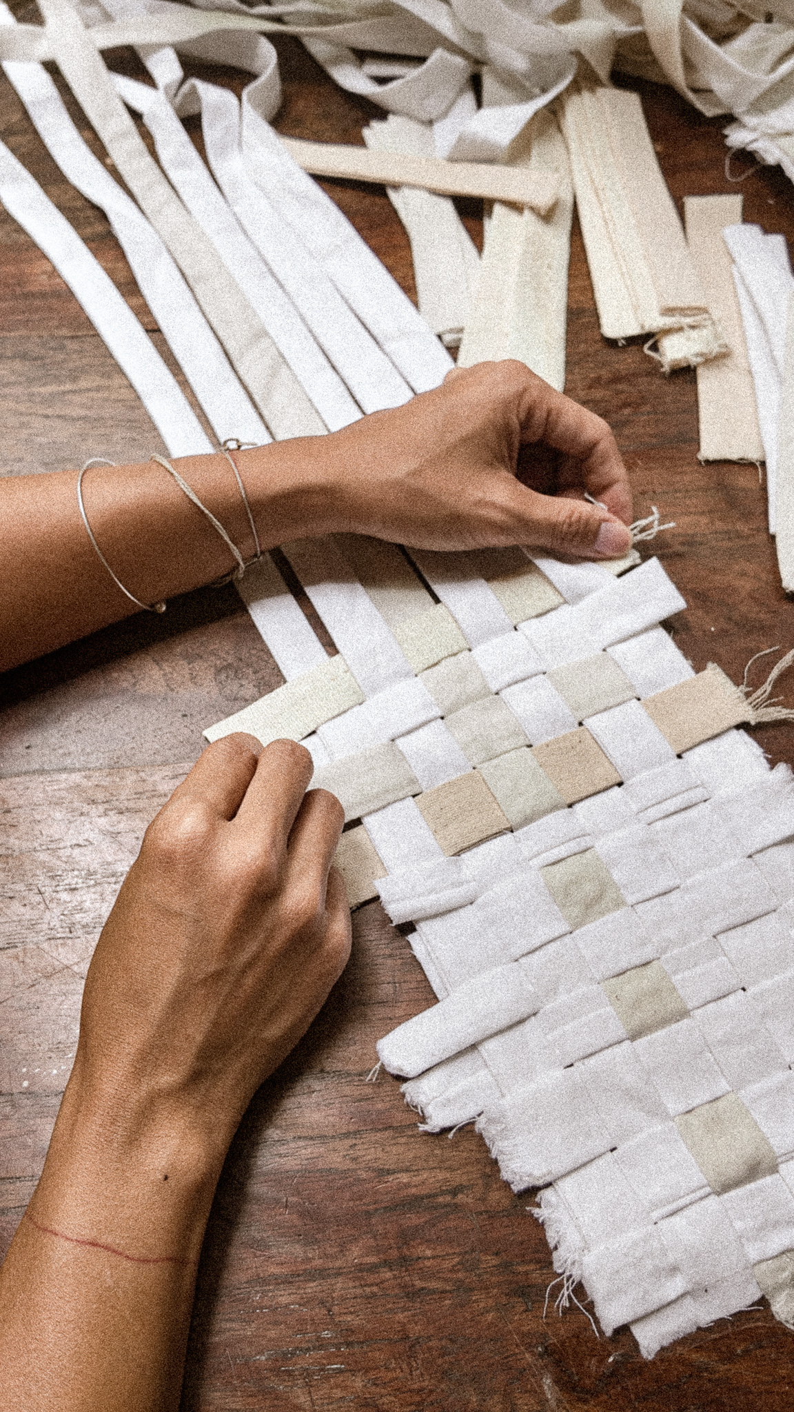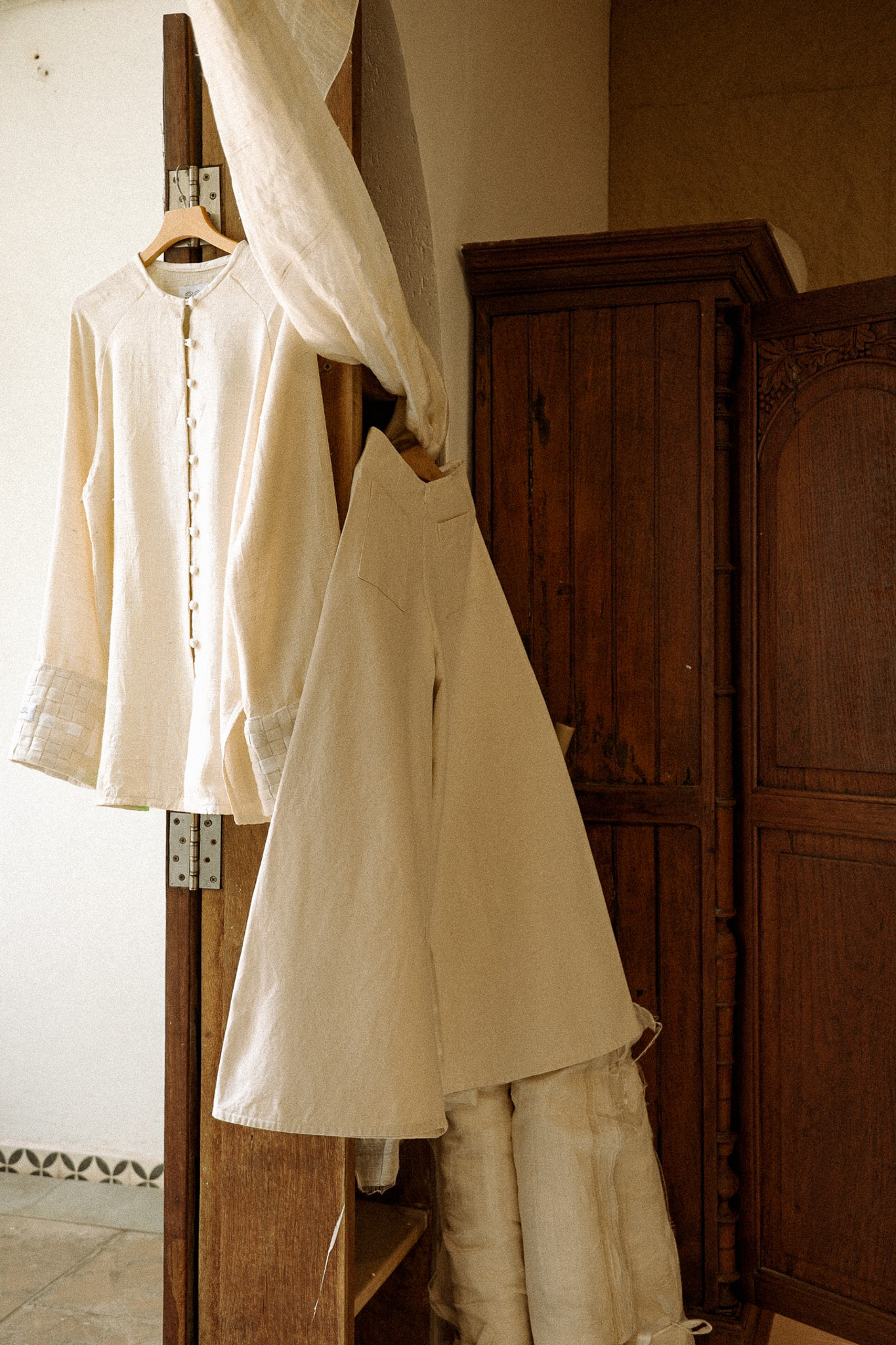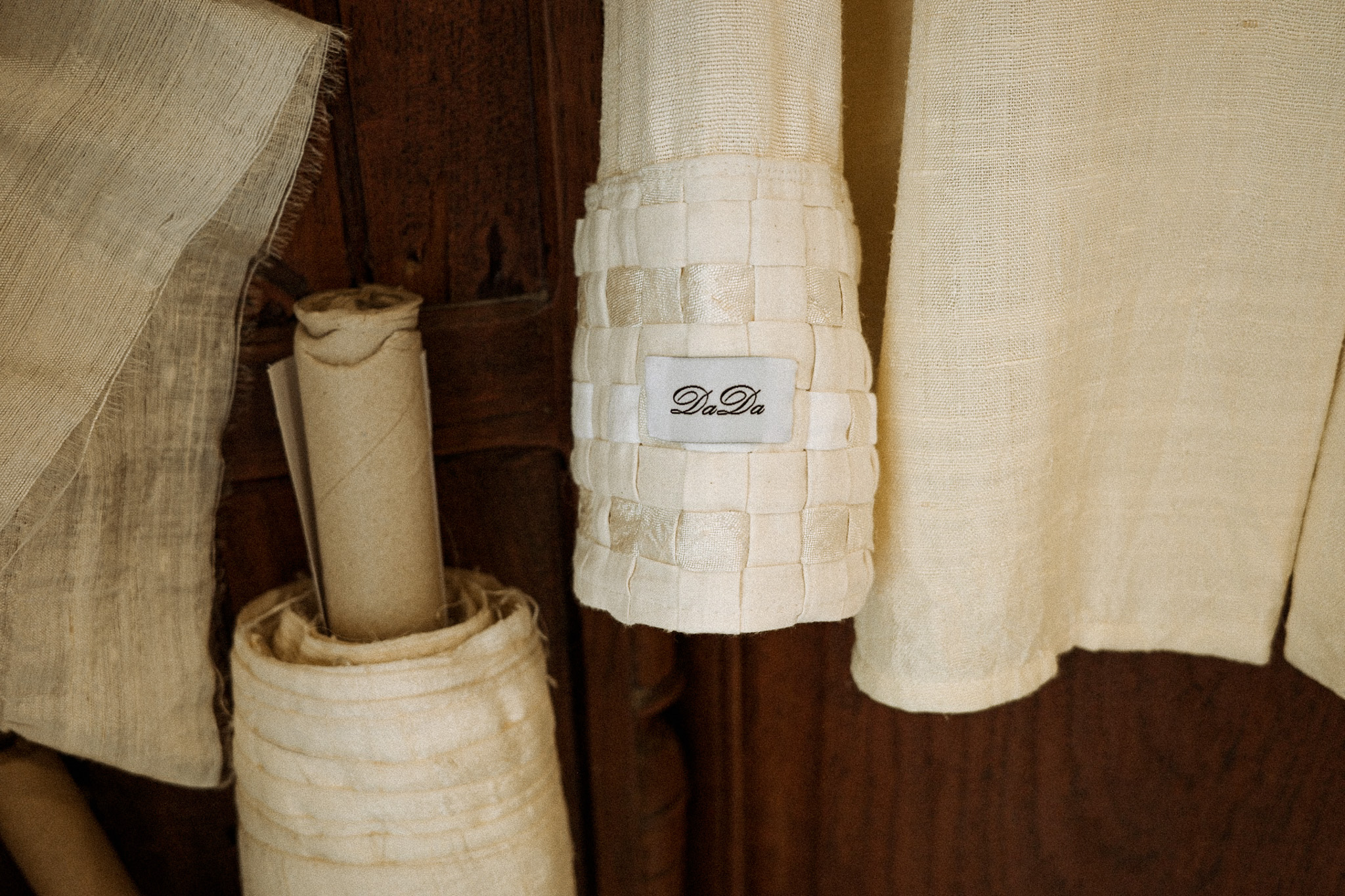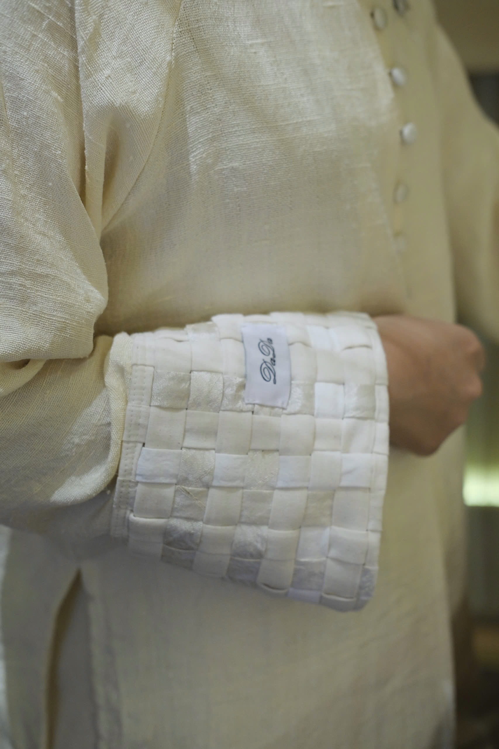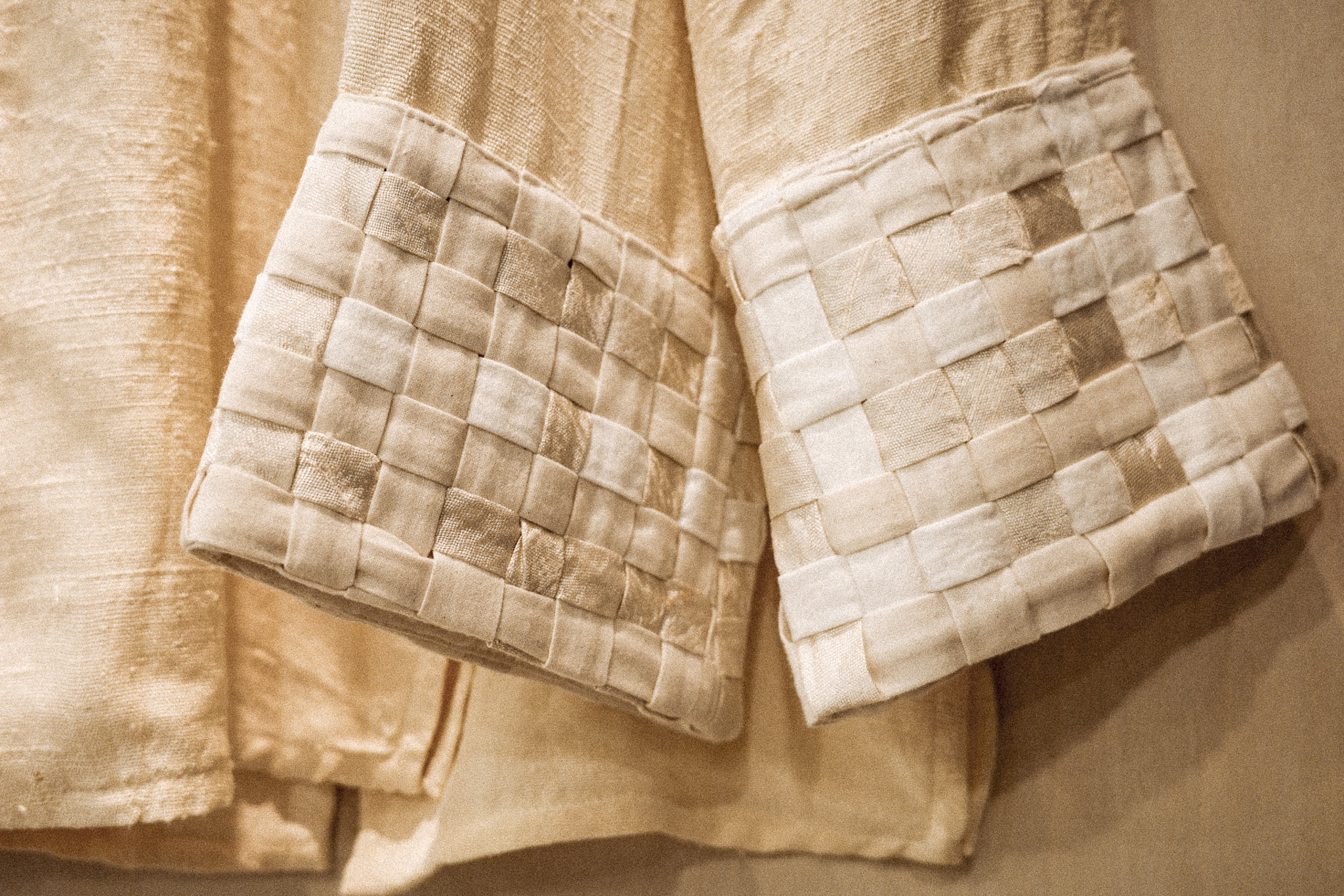 Lụa tơ tằm Việt Nam, dệt tay, giữ nguyên sắc trắng ngà của kén – một bề mặt còn nguyên độ thô, gồ ghề, chưa xử lý.
